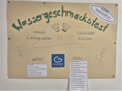 Im Rahmen von UMI Supermarkt 2.0 führten die Schülerinnen und Schüler eine Wasserverkostung durch und verglichen normales Leitungswasser mit belebtem GRANDER® Wasser. Die Rückmeldungen waren bemerkenswert. Viele beschrieben das GRANDER® Wasser als weicher, frischer und insgesamt angenehmer im Geschmack. Seitdem wird die eingerichtete Wasserstation regelmäßig genutzt und das Befüllen der eigenen Trinkflasche ist für viele zur Selbstverständlichkeit geworden.